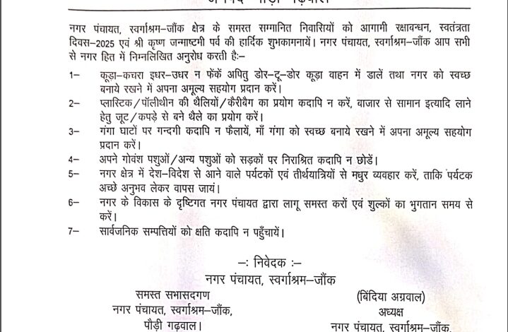 दिवस – 2025 एवं श्री कृष्ण जन्माष्टमी पर्व की हार्दिक शुभकामनायें नगर पंचायत, स्वर्गाश्रम-जौंक आप सभी