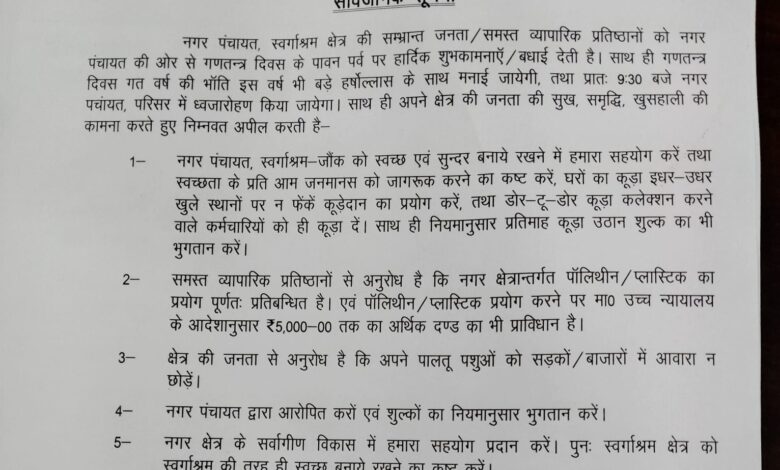नगर पंचायत स्वर्गाश्रम जोक की वर्तमान अध्यक्ष विंदिया अग्रवाल ने गणतंत्र दिवस के अवसर पर समस्त देशवासियों को हार्दिक शुभकामनाएं दी हैं। उन्होंने कहा कि यह दिन हमें भारतीय संविधान के मूल्यों को अपनाने और लोकतंत्र को मजबूत करने की प्रेरणा देता है।